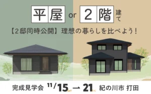 【完成見学会】11/15(土)~11/21(金) 紀の川市 打田|平屋・2階建てを2邸同時公開!理想の暮らしを比べよう!新着!!