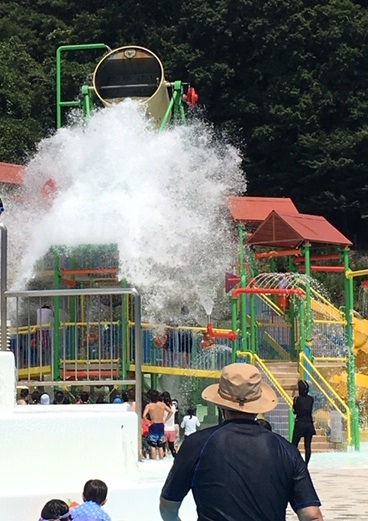 巨大バケツにたまった水が一気に
