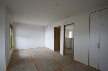 こちらは寝室と洋室のお部屋ですが、今はまだ壁の仕切りを設置していないようです。将来を見据えての間取りでしょうか。